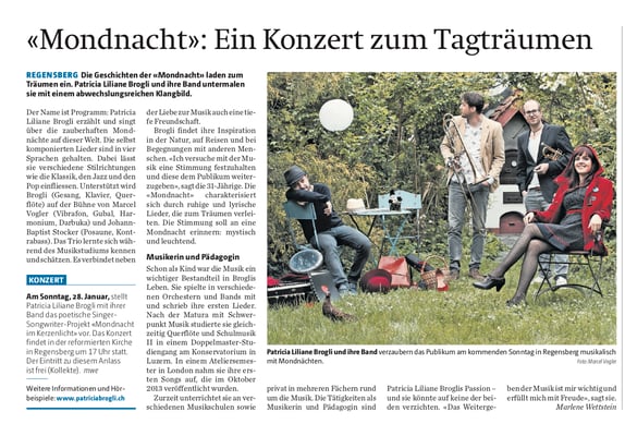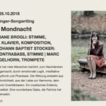 Für mein Singer-Songwriter-Projekt Mondnacht texte, komponiere und arrangiere ich Lieder in vier Sprachen. Seit zwei Jahrzehnten erzähle und begleite ich Geschichten, die ich erfahren habe; die mich bewegt und inspiriert haben. Unvergessen sind die Konzerte unter dem Kronleuchter, im Wohnzimmer, im Garten, am See, in den Bergen, zu Candle-light-Dinners, auf Bühnen, Wiesen und unter dem Mond. Ich schätze mich glücklich, mit sehr vielseitig begabten Musikern zu arbeiten und bin immer wieder daran, neue Konzepte zu entwerfen und Lieder zu schreiben.